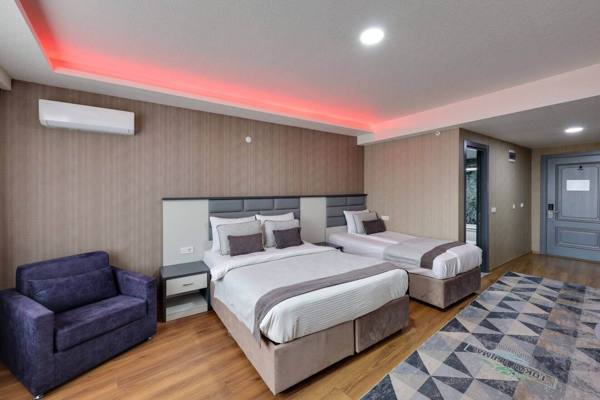 1 çift, 2 tek kişilik yatak bulunmaktadır. termal su mevcuttur. Ara kapılı 1+1'dir. Küvetler jakuzi özelliklidir.